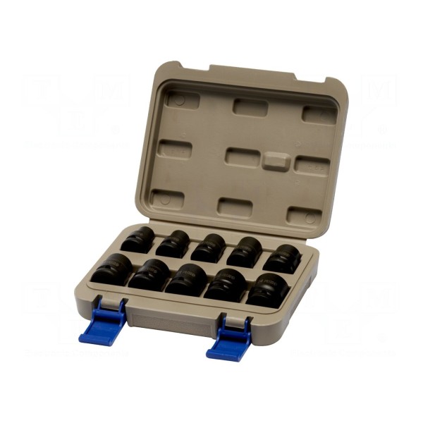 Zestaw zawiera 10 kluczy nasadowych udarowych o profilu 6-kątnym. Komplet został zaprojektowany do współpracy z narzędziami posiadającymi gniazdo uchwytu o rozmiarze 1/2".