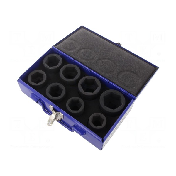 Zestaw kluczy udarowych zawiera 8 sztuk narzędzi o konstrukcji 6-kątnej. Nasadki przeznaczone są do współpracy z narzędziami wyposażonymi w gniazdo montażowe o rozmiarze 3/4".