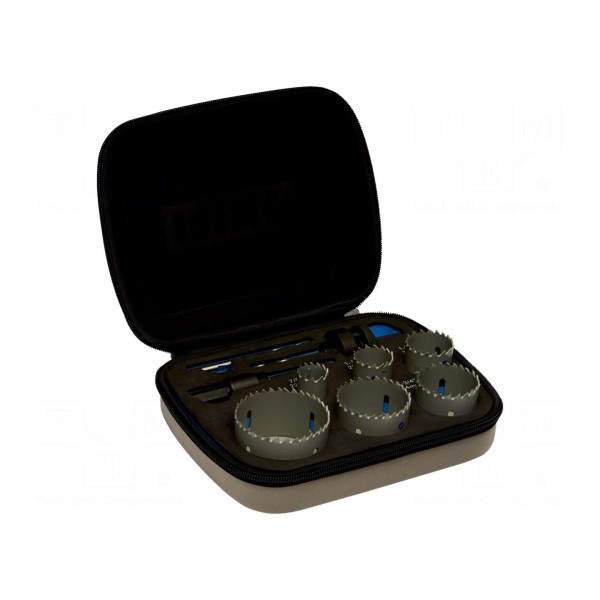 Zestaw zawiera sześć otwornic o średnicach 22mm, 29mm, 35mm, 44mm, 51mm oraz 64mm. Narzędzia przeznaczone są do obróbki materiałów takich jak drewno, metal oraz plastik.