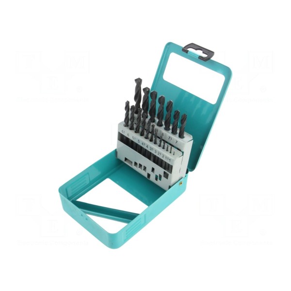 Zestaw zawiera 19 wierteł wykonanych ze stali szybkotnącej HSS. Narzędzia przeznaczone są do obróbki metalu oraz stali. Zakres średnic wierteł w komplecie obejmuje wymiary od 1 mm do 10 mm, przy zachowaniu skoku co 0,5 mm.