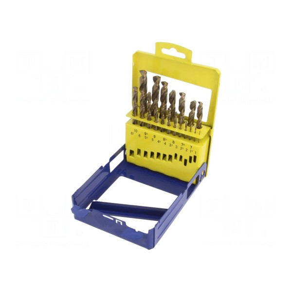 W skład kompletu wchodzą wiertła o średnicach od 1 mm do 10 mm, stopniowane co 0,5 mm. Narzędzia przeznaczone są do obróbki stali oraz stali nierdzewnej.
