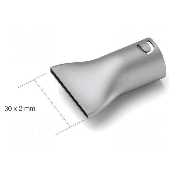 Dysza gorącego powietrza o wymiarach 30x2mm przeznaczona jest do wykorzystania ze stacjami lutowniczymi JBC TOOLS. Produkt został wykonany w wersji ESD, co pozwala na bezpieczne stosowanie go w środowiskach wymagających ochrony przed wyładowaniami elektrostatycznymi.