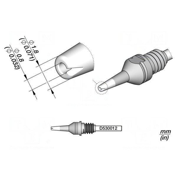 Grot przeznaczony jest do zastosowania w urządzeniach typu rozlutownica. Element charakteryzuje się wymiarami końcówki wynoszącymi 1,8x0,8mm.