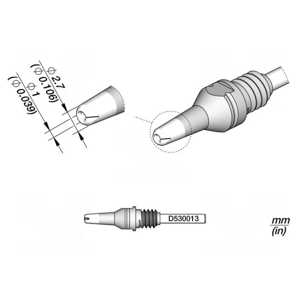 Grot przeznaczony jest do wykorzystania w urządzeniach rozlutowniczych. Element charakteryzuje się wymiarami roboczymi wynoszącymi 2,7x1 mm.
