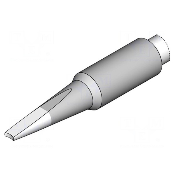 Grot lutowniczy typu wkrętakowego o wymiarach 0,5x1,5 mm został wyposażony w zintegrowaną grzałkę. Jego konstrukcja charakteryzuje się wydłużonym kształtem, co umożliwia dostęp do trudno dostępnych miejsc na płytkach drukowanych. Element posiada właściwości typu longlife, które przekładają się na dłuższą żywotność przy standardowych pracach lutowniczych.