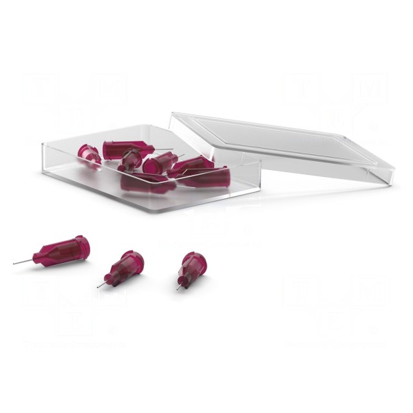 Produkt stanowi stalowa igła prosta o rozmiarze 25, przeznaczona do precyzyjnych prac dozujących. Element wyposażono w standardowe mocowanie typu Luer Lock, które zapewnia połączenie z kompatybilnymi głowicami. Korpus igły posiada czerwony kolor ułatwiający identyfikację.