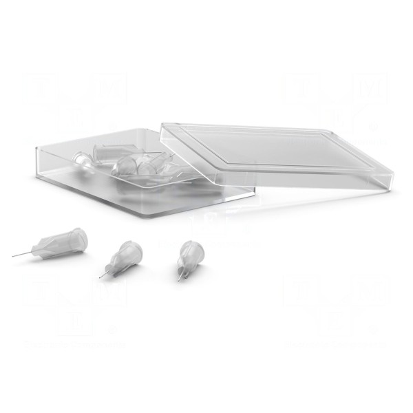 Igła stalowa o rozmiarze 27 charakteryzuje się prostym kształtem oraz długością wynoszącą 0,25 cala. Element został wyposażony w przezroczysty korpus oraz standardowe mocowanie typu Luer Lock.