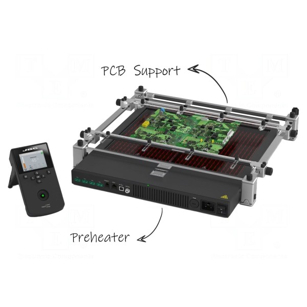 Podgrzewacz JBC TOOLS PHBE-2KB to urządzenie o mocy 1,8kW przeznaczone do przygotowania płytek drukowanych przed montażem lub demontażem komponentów oraz do regeneracji układów BGA. Urządzenie oferuje powierzchnię roboczą o wymiarach 360x277mm i pracuje w zakresie regulacji temperatury od 50°C do 250°C z dokładnością pomiaru ±5°C. Kontrola parametrów odbywa się cyfrowo za pomocą przycisków, a układ zapewnia sterowanie mikroprocesorowe.