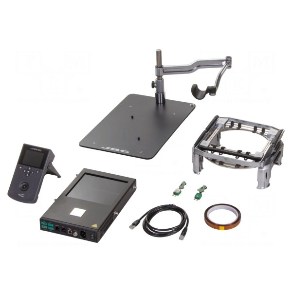 Wymiary urządzenia wynoszą 195x288x42 mm, a zasilanie realizowane jest napięciem 230V AC. W zestawie: instrukcja obsługi, kabel przyłączeniowy RJ45, kabel zasilający, konsola operatorska, regulowane ramię robocze, taśma wysokotemperaturowa, dwie termopary typu K oraz uchwyt PCB JBC-PSS-A.