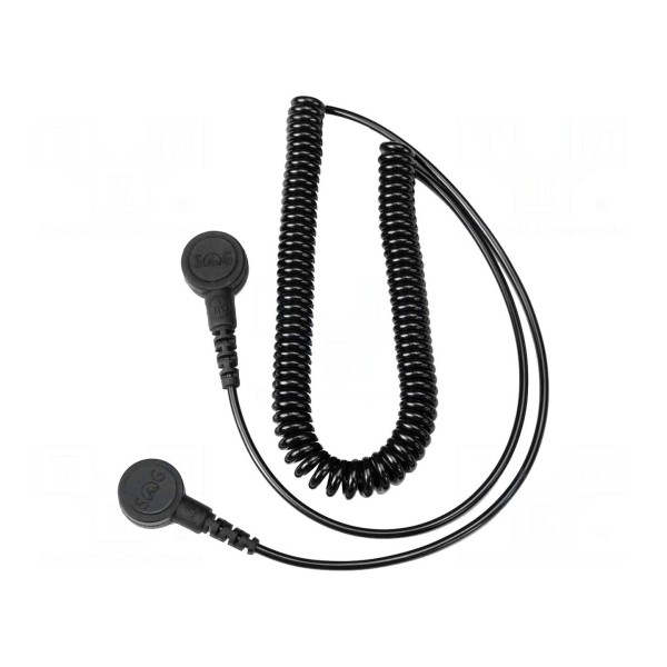 Zakończenia przewodu stanowią zatrzaski żeńskie o średnicach 3 mm oraz 10 mm. Produkt jest wykończony w kolorze czarnym i przeznaczony do podłączania opasek ESD do punktów uziemienia w stanowiskach pracy.