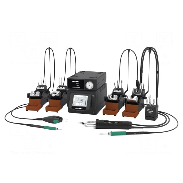 Urządzenie posiada złącza USB typu A i B oraz gniazdo uziemiające, a także dedykowane złącze do podłączenia pedału sterującego. Wymiary stacji wynoszą 232x148x120mm. W zestawie: gorące mikroszczypce JBC-AM120-A, lutownica JBC-T210-A, lutownica JBC-T245-A, moduł podciśnienia JBC-MSE-A, pedał JBC-P405, podstawka JBC-AD-SF x2, podstawka JBC-AM-SB, podstawka JBC-DR-SF, rozlutownica JBC-DR560-A, stacja bazowa, stojak na groty JBC-SCH-A.