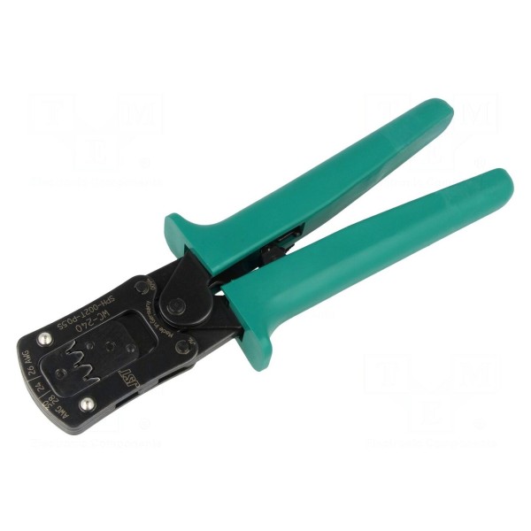 Narzędzie do zaciskania JST WC-240 zostało wykonane ze stali i przeznaczone jest do pracy z przewodami o przekroju 24AWG, 26AWG oraz w zakresie 30AWG do 28AWG. Całkowita długość urządzenia wynosi 193mm.