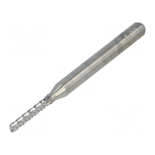 Frez diamentowy przeznaczony jest do obróbki materiałów przy użyciu elektronarzędzi. Narzędzie wyposażone jest w końcówkę o średnicy 1,8mm oraz trzpień montażowy o średnicy 3,175mm.