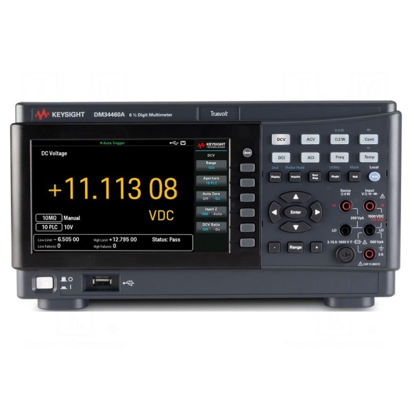 Multimetr stołowy KEYSIGHT DM34460A to urządzenie pomiarowe wyposażone w wyświetlacz LCD TFT o przekątnej 7" i rozdzielczości 480x272 piksele. Przyrząd oferuje rozdzielczość 6,5 cyfry (2000000) oraz próbkowanie na poziomie 1000x/s. Urządzenie obsługuje pomiar rzeczywistej wartości skutecznej True RMS AC oraz wykonuje pomiary napięcia DC i AC, prądu DC i AC, rezystancji (2- i 4-przewodowej), pojemności, częstotliwości w zakresie 3...300kHz oraz temperatury. Wyposażone jest w test diody (5V) oraz akustyczny test ciągłości obwodu.