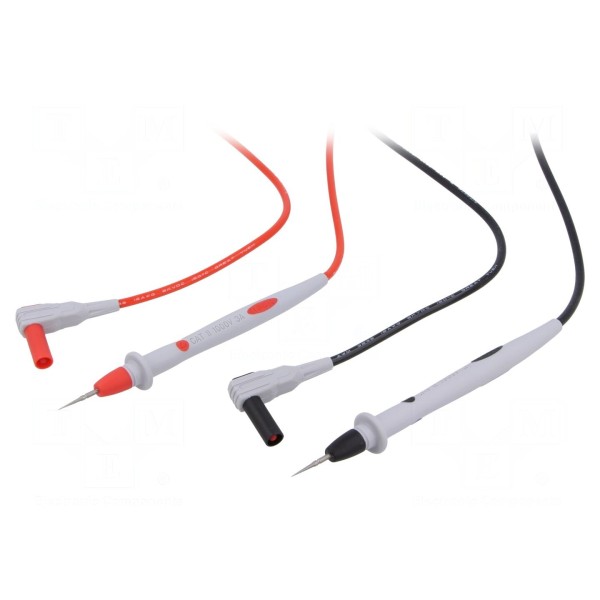 Przewody pomiarowe o długości 1,2 m zostały zaprojektowane do pracy przy prądzie znamionowym wynoszącym 3 A. Konstrukcja każdego z przewodów obejmuje końcówkę pomiarową oraz kątowy wtyk bananowy o średnicy 4 mm. Zestaw składa się z dwóch przewodów w kolorze czarnym i czerwonym.
