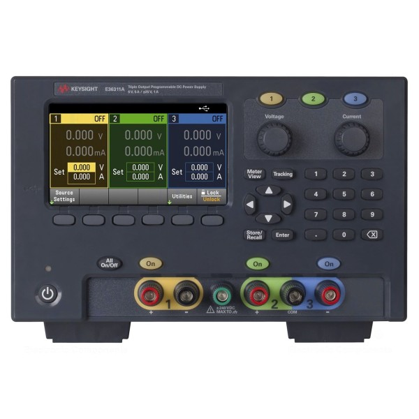 Zasilacz laboratoryjny KEYSIGHT E36311A to programowalne urządzenie wielokanałowe wyposażone w trzy wyjścia prądowe. Kanał pierwszy oferuje parametry 6V DC przy 5A, natomiast kanał drugi i trzeci zapewniają odpowiednio 25V DC przy 1A oraz -25V DC przy 1A. Urządzenie charakteryzuje się stabilizacją napięcia na poziomie ≤0,01%+ 2mV oraz stabilizacją prądu ≤0,01%+ 250µA, przy tętnieniach i szumach dla napięcia regulowanego wynoszących ≤0,35mVrms.