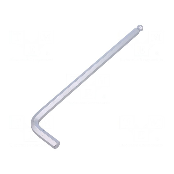 Klucz imbusowy z końcówką kulistą HEX o rozmiarze 8 mm został wykonany ze stali stopowej. Narzędzie charakteryzuje się wydłużoną konstrukcją o łącznej długości 208 mm, co ułatwia dostęp do śrub w trudno dostępnych miejscach.