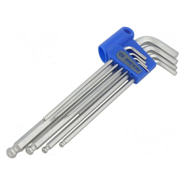 Zestaw zawiera osiem kluczy imbusowych o wydłużonej konstrukcji, wyposażonych w zakończenie typu kulistego. Taka budowa umożliwia pracę pod kątem w trudno dostępnych miejscach, ułatwiając obsługę śrub z gniazdem sześciokątnym.