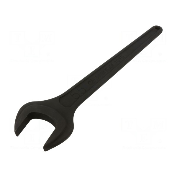 Klucz płaski jednostronny o rozmiarze 55 mm wykonany jest ze stali chromowo-wanadowej. Narzędzie zostało poddane procesowi fosforowania, co wpływa na jego wykończenie powierzchniowe.