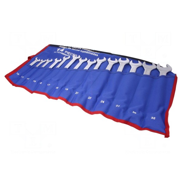 Zestaw zawiera 14 kluczy płasko-oczkowych o rozmiarach 10mm, 11mm, 13mm, 14mm, 16mm, 17mm, 18mm, 19mm, 21mm, 22mm, 24mm, 27mm, 30mm oraz 32mm. Narzędzia te przeznaczone są do prac montażowych i serwisowych wymagających obsługi śrub oraz nakrętek w wymienionych zakresach rozmiarowych.