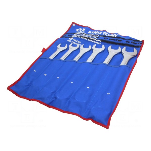 Zestaw kluczy płasko-oczkowych KING TONY zawiera sześć elementów o zróżnicowanych wymiarach. W komplecie znajdują się narzędzia w rozmiarach 34mm, 36mm, 38mm, 41mm, 46mm oraz 50mm.