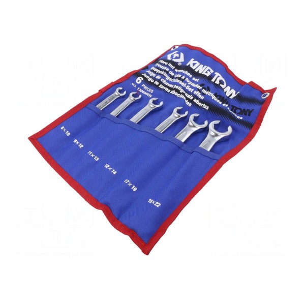 W komplecie znajduje się 6 sztuk kluczy o rozmiarach: 8 mm, 10 mm, 11 mm, 12 mm, 13 mm, 14 mm, 17 mm, 19 mm oraz 22 mm. Całość zestawu dostarczana jest w etui, które ułatwia przechowywanie i organizację narzędzi w warsztacie.