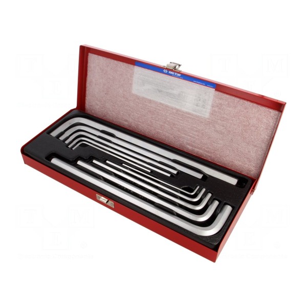 Zestaw zawiera dziesięć kluczy imbusowych w wersji długiej, przeznaczonych do prac montażowych z gniazdami typu HEX. Narzędzia charakteryzują się wydłużoną konstrukcją, co pozwala na wygodny dostęp do głębiej osadzonych śrub.