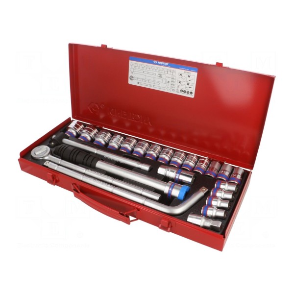 Zestaw narzędzi zawiera 24 elementy, w tym klucze nasadowe 6-kątne przeznaczone do prac montażowych i warsztatowych. Komplet został zaprojektowany do współpracy z napędami o rozmiarze gniazda uchwytu 1/2".