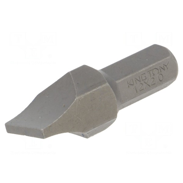 Końcówka wkrętakowa typu płaskiego o wymiarach grotu 12x2 mm. Element został zaprojektowany do współpracy z uchwytami narzędziowymi o rozmiarze gniazda 5/16" oraz typie mocowania C8.