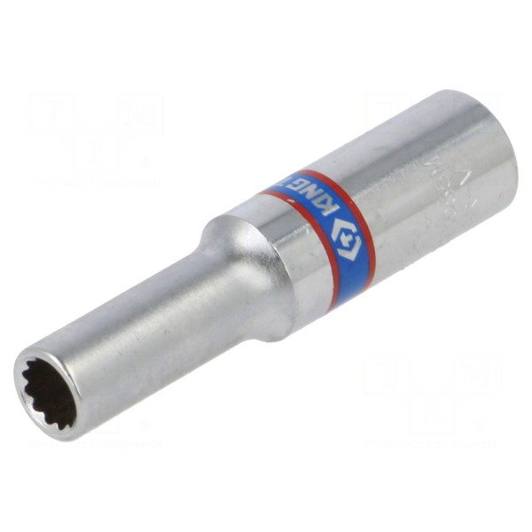 Nasadka KING TONY 223055M to narzędzie typu 12-kątnego o rozmiarze 5,5 mm. Element posiada gniazdo uchwytu w standardzie 1/4".