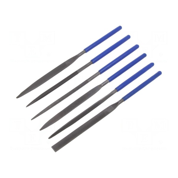 Zestaw zawiera sześć pilników przeznaczonych do obróbki metalu. Komplet obejmuje narzędzia o różnych kształtach przekroju, w tym profile mieczowe, okrągłe oraz płaskie, co umożliwia dostosowanie narzędzia do specyfiki wykonywanej pracy.
