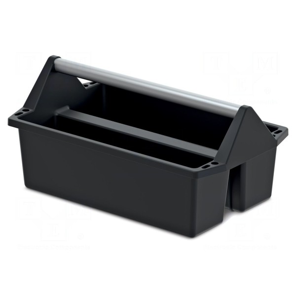 Pojemnik wyposażony jest w ergonomiczny uchwyt wykonany z aluminium, co ułatwia przenoszenie obciążonej skrzynki. Materiał, z którego wykonano korpus, zapewnia odpowiednią trwałość podczas codziennej eksploatacji w środowisku warsztatowym.