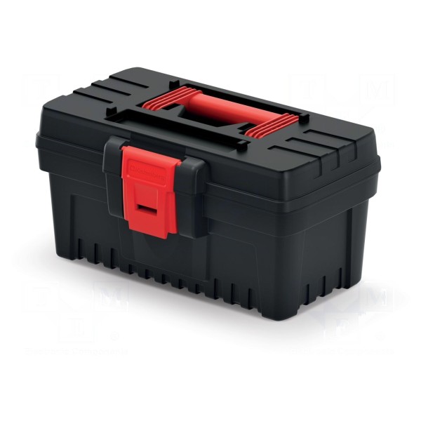 Skrzynka narzędziowa wykonana z polimeru w kolorze czarnym przeznaczona do przechowywania i transportu narzędzi. Konstrukcja charakteryzuje się wymiarami zewnętrznymi wynoszącymi 296x177x155 mm oraz maksymalnym udźwigiem 10 kg.