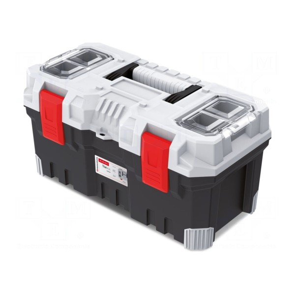 Wyposażenie skrzynki obejmuje wbudowane nosidło na narzędzia oraz dwa organizery zintegrowane w pokrywie. Zastosowane zapięcia wykonane są z tworzywa ABS, a wygodę transportu zapewnia zintegrowana rączka do noszenia.