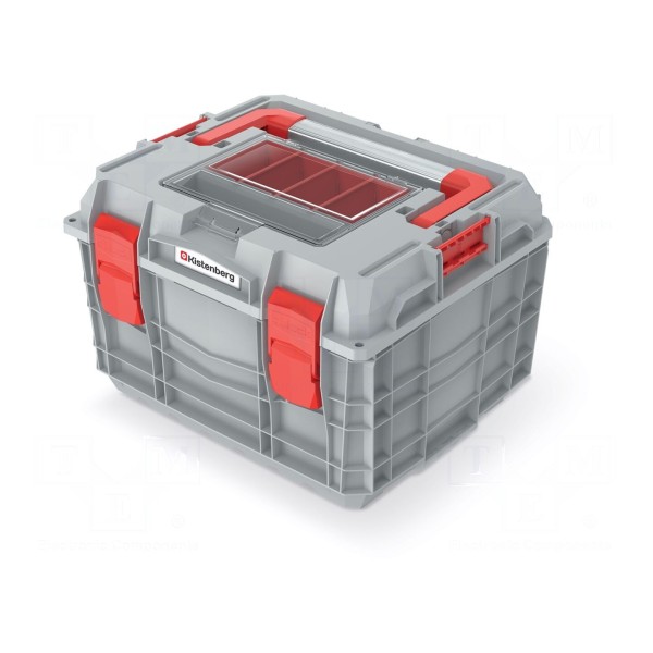 Skrzynka narzędziowa o wymiarach zewnętrznych 450x380x297mm wykonana jest z polimeru w kolorze szarym. Konstrukcja charakteryzuje się klasą szczelności IP55, co zapewnia ochronę przed pyłem oraz wilgocią. Maksymalny udźwig pojemnika wynosi 25kg.