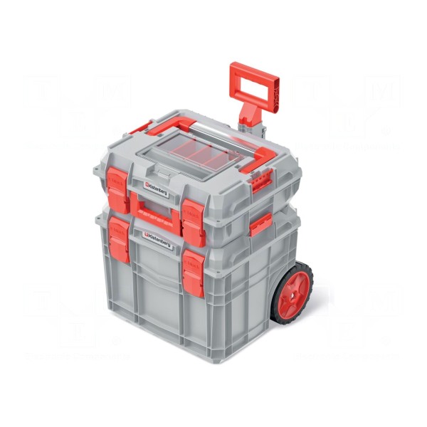 Pokrywa skrzynki posiada zintegrowany organizer, a cała konstrukcja zabezpieczona jest zapięciami wykonanymi z ABS. Zewnętrzne wymiary pojemnika wynoszą 450x380x545 mm. Produkt przeznaczony jest do przechowywania małych i średnich elementów elektronicznych oraz mechanicznych.