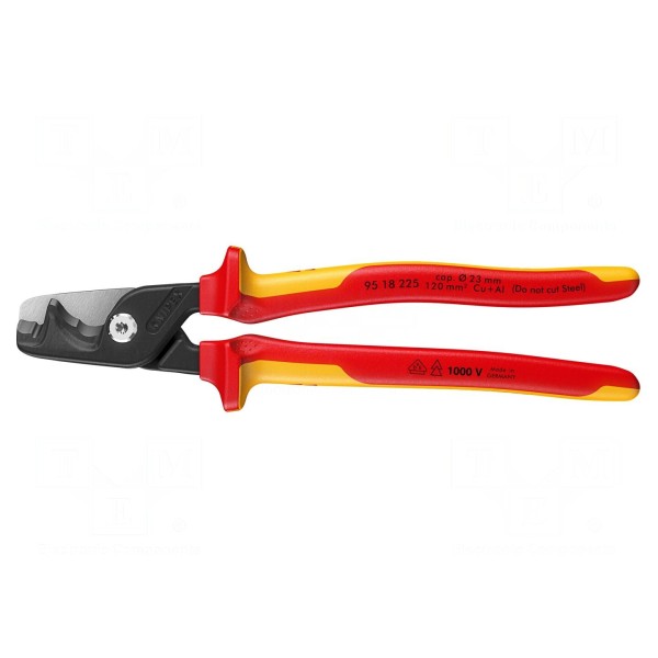 Nożyce przeznaczone są do cięcia kabli miedzianych oraz aluminiowych. Narzędzie posiada stopniowane krawędzie tnące o twardości około 56 HRC, co umożliwia efektywne przecinanie przewodów o przekroju do 35mm².