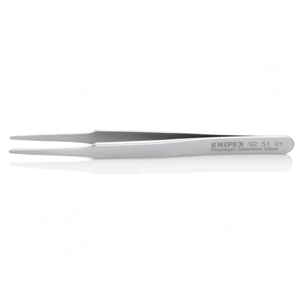 Pęseta prosta o długości 120 mm wykonana ze stali nierdzewnej. Narzędzie charakteryzuje się precyzyjnym wykonaniem oraz zaokrąglonym kształtem końcówki.