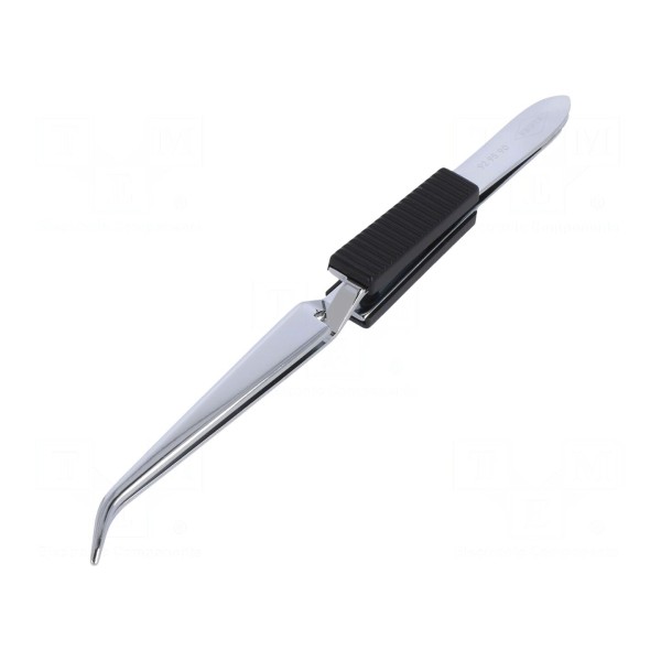 Narzędzie typu pęseta o długości 160 mm przeznaczone jest do wykonywania prac precyzyjnych. Konstrukcja charakteryzuje się zagiętymi ostrzami oraz płaskim kształtem końcówki, co umożliwia chwytanie drobnych elementów.