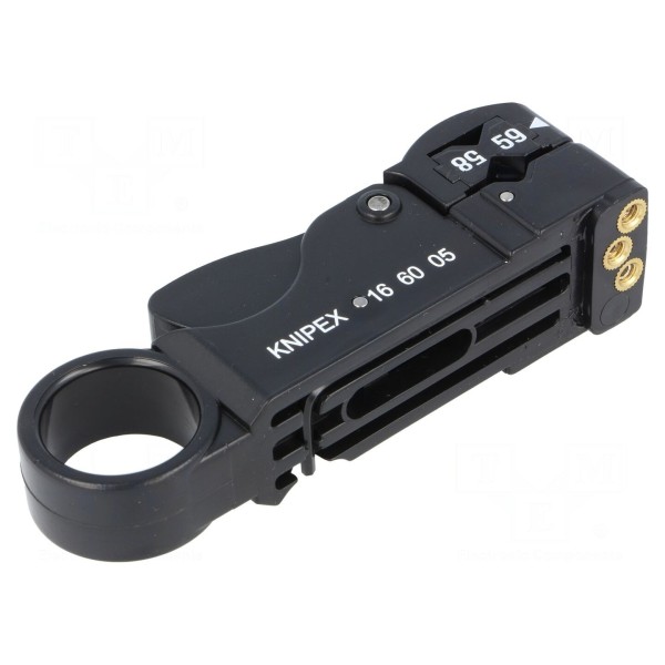 Długość całkowita urządzenia wynosi 105mm. Konstrukcja przystosowana jest do prac przy instalacjach telekomunikacyjnych i antenowych wymagających precyzyjnego zdejmowania izolacji z kabli typu koncentrycznego.