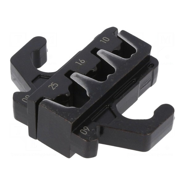 Szczęki do zaciskania przeznaczone są do obróbki końcówek tulejkowych. Element umożliwia pracę z przewodami o przekroju 7mm², 16mm² oraz 25mm², co odpowiada rozmiarom 3AWG, 5AWG oraz 7AWG.