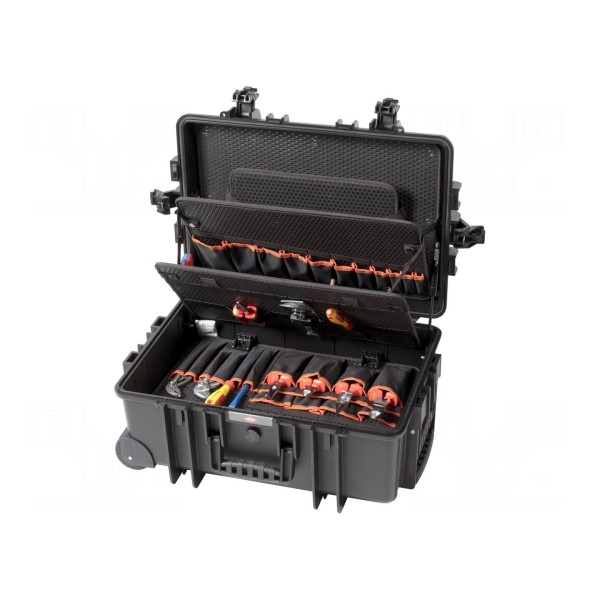 Walizka o wymiarach 428x425x262mm wykonana jest z tworzywa sztucznego, co zapewnia ochronę zawartości podczas transportu i przechowywania. Dzięki kompaktowej konstrukcji, całość umożliwia łatwą organizację narzędzi w środowisku pracy.