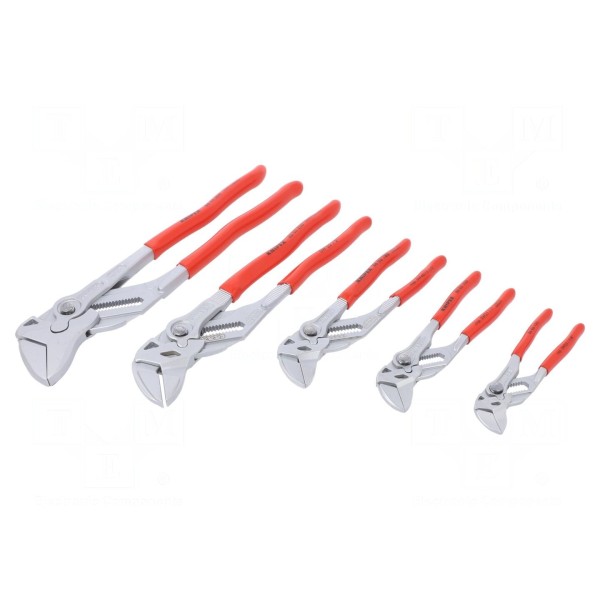 Zestaw składa się z pięciu szczypiec nastawnych, które umożliwiają pracę w zróżnicowanych warunkach warsztatowych. Narzędzia zostały wykonane ze stali, co zapewnia ich trwałość podczas codziennej eksploatacji.