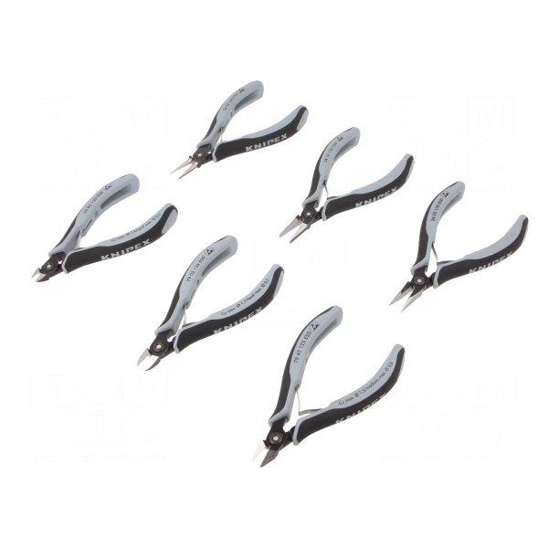 Zestaw zawiera sześć sztuk szczypiec przeznaczonych do prac precyzyjnych w środowiskach wymagających ochrony przed wyładowaniami elektrostatycznymi. W skład kompletu wchodzą szczypce do cięcia oraz modele o kształcie okrągłym i półokrągłym.