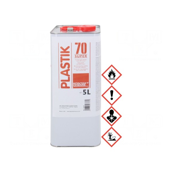 PLASTIK 70 SUPER to przezroczysta powłoka ochronna w postaci płynu, dostarczana w puszce o pojemności 5 litrów. Preparat znajduje zastosowanie przy izolowaniu, uszczelnianiu oraz ochronie przed korozją elementów elektronicznych i płytek drukowanych.