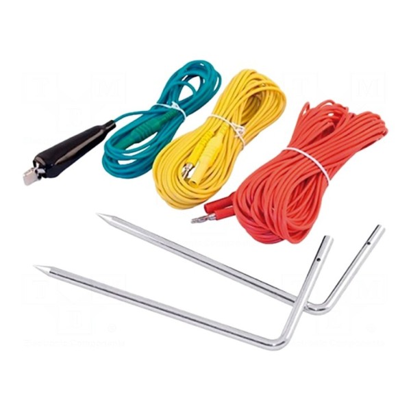 Zestaw przeznaczony jest do pomiaru rezystancji uziemienia. Elementy wyposażenia wykonane są w kolorach czerwonym, zielonym i żółtym, co umożliwia szybką identyfikację poszczególnych przewodów pomiarowych.