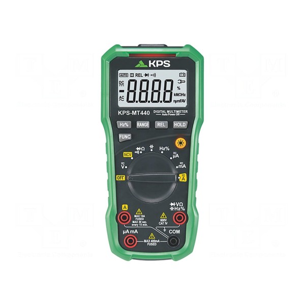 Multimetr cyfrowy KPS MT440 umożliwia pomiar parametrów elektrycznych, w tym napięcia AC i DC, prądu AC i DC, rezystancji, częstotliwości oraz pojemności. Urządzenie wyposażone jest w wyświetlacz LCD o rozdzielczości 4000 z funkcją podświetlenia, co ułatwia odczyt wyników w różnych warunkach oświetleniowych. Przyrząd obsługuje również testy diody przy napięciu 1,5V oraz sprawdzanie ciągłości obwodu.