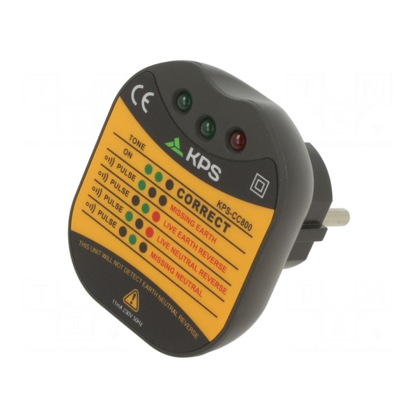 Tester gniazd sieciowych KPS CC800 przeznaczony jest do kontroli poprawności instalacji w standardzie europejskim. Przyrząd pracuje przy napięciu 230V AC oraz częstotliwości w zakresie od 50Hz do 60Hz. Wyniki pomiarów prezentowane są za pomocą czytelnego układu diod LED.