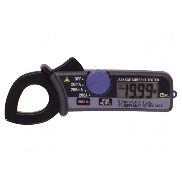 Miernik cęgowy KYORITSU KEW2431 przeznaczony jest do pomiaru prądu AC oraz prądu upływu. Urządzenie oferuje zakresy pomiarowe wynoszące 20mA, 200mA oraz 200A w paśmie częstotliwości od 40Hz do 400Hz. Dokładność pomiaru prądu AC wynosi ±(2% + 4 digit), a maksymalna średnica mierzonego przewodu to 24mm.