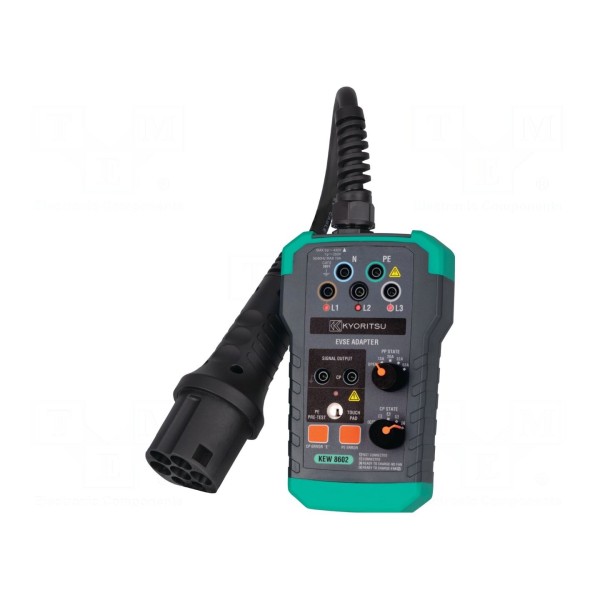 Zestaw adapterów testowych KYORITSU KEW8602 służy do diagnostyki stacji ładowania pojazdów elektrycznych typu 3. Urządzenie pozwala na testowanie przewodu PP, przewodu sterującego CP oraz wyzwalania RCD 30 mA i RCD-DD 6 mA. Maksymalne napięcie wejściowe wynosi 250/430V, a prąd maksymalny to 10A.